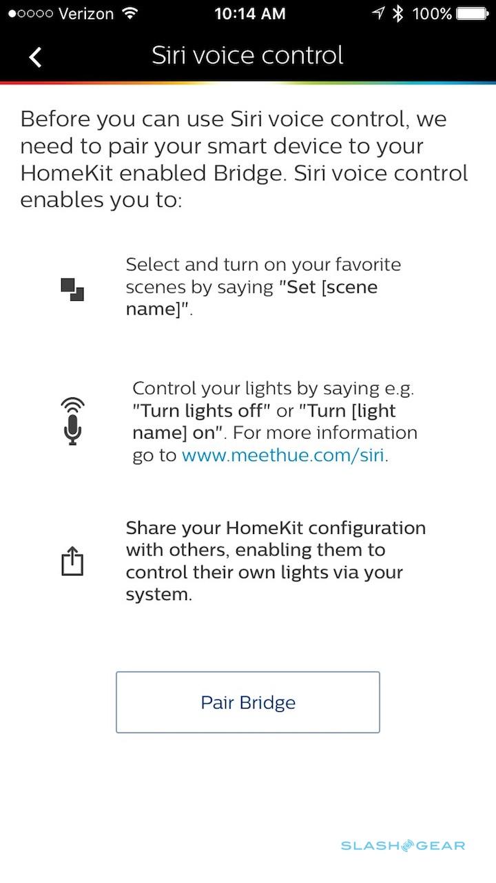 It's worth noting that the Hue Bridge 2.0 isn't a HomeKit bridge, and the Hue app isn't a HomeKit app. It might seem like a minor distinction – being compatible with Apple's smart home platform rather than a HomeKit hub itself – but it means you'll need a third-party app if you want the full support.