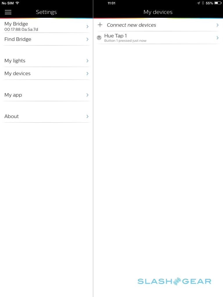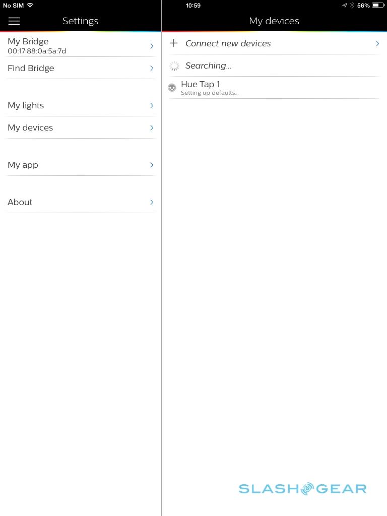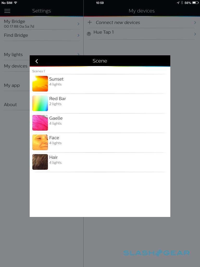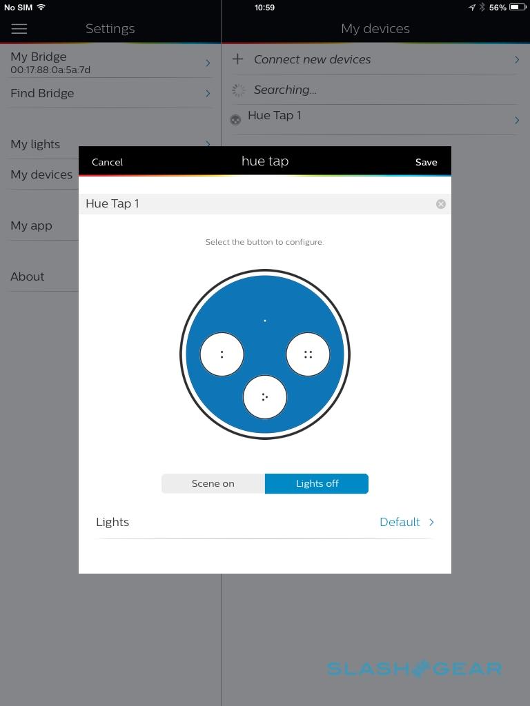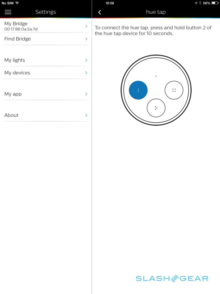 Setup is just as easy as physical installation, as long as you have the latest firmware running on both the hue app and all the bulbs and the bridge. A new "My devices" option appears in the Settings page of the app, and after you press and hold the two-dot button for ten seconds and then release it, Hue Tap shows up in the list. Up to 25 can be paired with any one hub, and each renamed.
