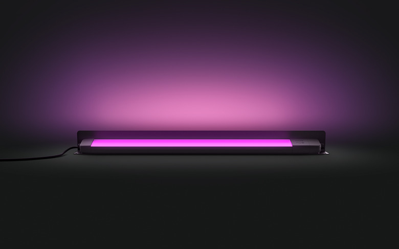 The Philips Hue Amarant is what Signify is calling a "linear spotlight" – effectively making a wash of color for a wall. It's designed to be placed on the floor, wall mounted, or even hung up in the eaves of an overhanging roof, and is rated for outdoor use as part of the company's LowVolt luminaire collection.