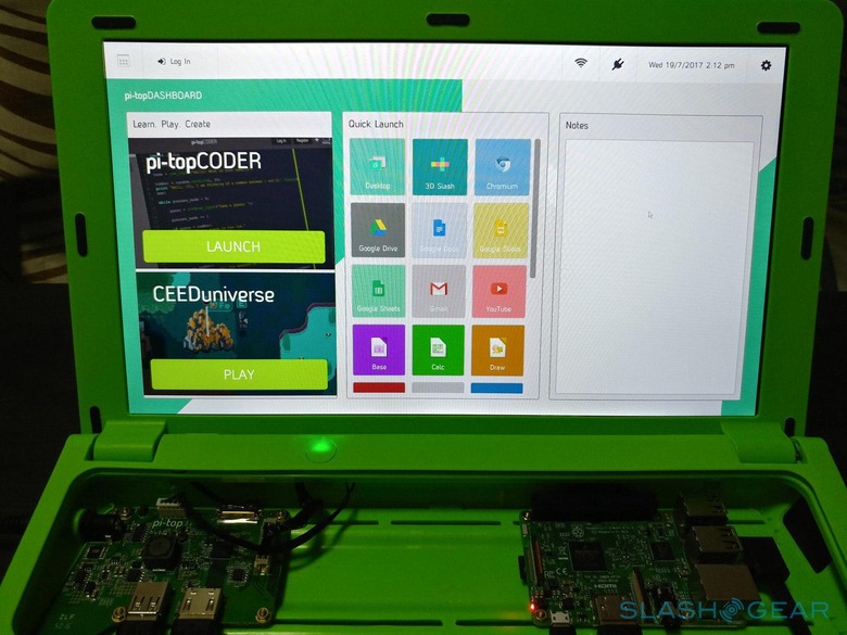 The pi-top Dashboard is a unique, customized launching pad for pi-topCODER and CEEDuniverse, pi-top's two special educational programs that we'll get to later. It also has shortcuts for most of the programs that pi-topOS has pre-installed, including the LibreOffice productivity suite, programming environments, and even some of Google's popular web services, which basically just launches the Chromium web browser. There's also a Notes panel that lets you easily jot down notes, reminders, text, and the like. The notes are saved between reboots.