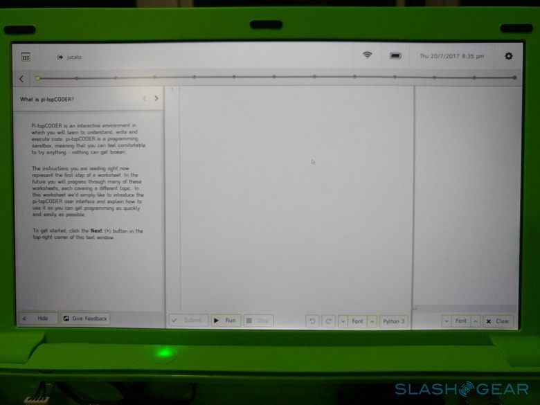 As exhilarating as the laptop assembly may have been, the pi-top adventure hardly stops there. After all, what is use a laptop if it doesn't have software to use it with. Of course, the Raspberry Pi has its own official operating system, Raspbian, but pi-top has gone the extra mile to refine that to provide an environment and an experience more suited for education, specifically programming. pi-topOS is still built on top of Raspbian and still provides many of the facilities familiar to Linux users, though it swaps out Xfce for LXDE. That said, the moment you first turn on the pi-top and every time you boot into it, you are greeted with a "desktop" that really wants you to get started with learning immediately.