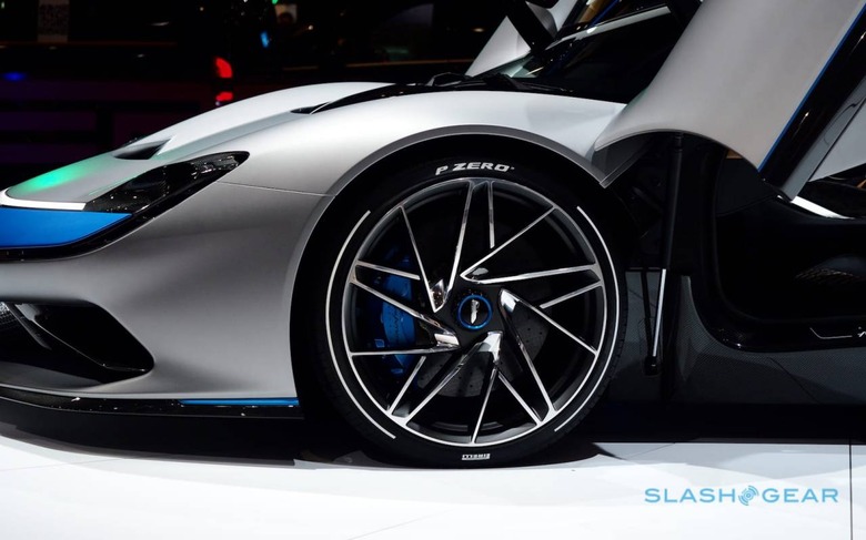 Of course, it's the design that first grabs you. The full carbon fiber monocoque is clad in a carbon fiber body, with an aluminum crash structure. It's shaped for extreme aero performance, but that hasn't left an ugly car. LED lighting and jewel-like detailing helps there, too, while the scissor doors add some extra drama.