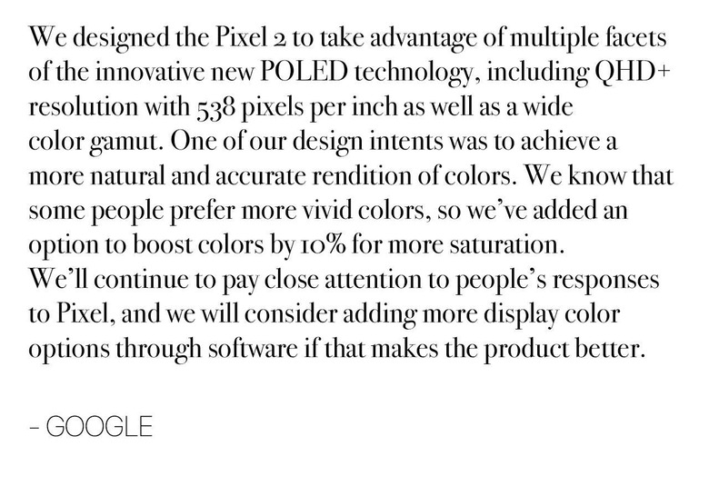 Over the past few days a bit of controversy popped up over the display on the Pixel 2 XL. The most common issue seen in descriptions of the device seems to have to do with the device's coloring and/or texture. Our own review by Chris Davies said that the display on the Pixel 2 XL is "muted and blue-tinged off-axis."