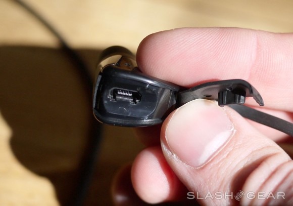 The unit is charged with microUSB via one of the two buds – right there in the back of its head. Charge the unit up fully and you'll have a straight 4+ hours of listening time easily. The cord is short enough that you're never ever going to get it tangled up – it's a sort of flat rubbery cord so it's also not going to slip away from you any time soon. It's just long enough to sit under your chin or around the back of your head as well, whatever you like.
