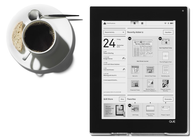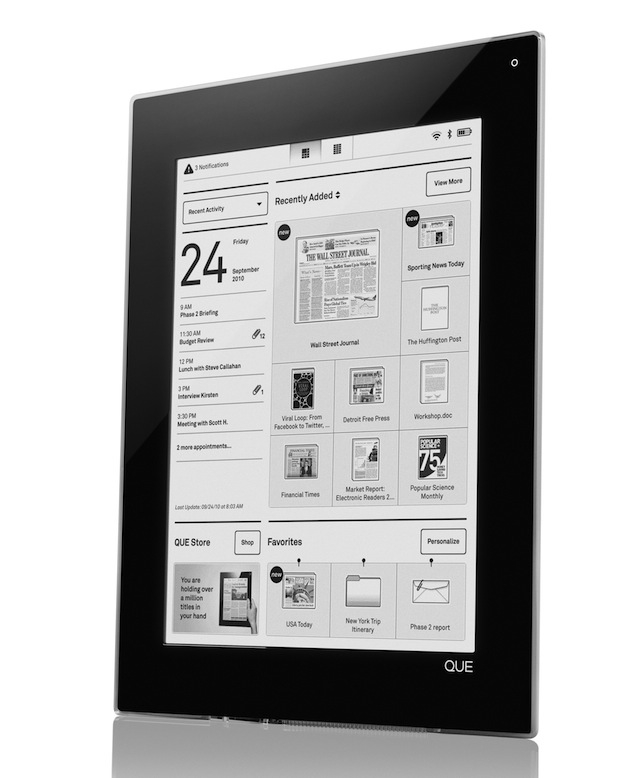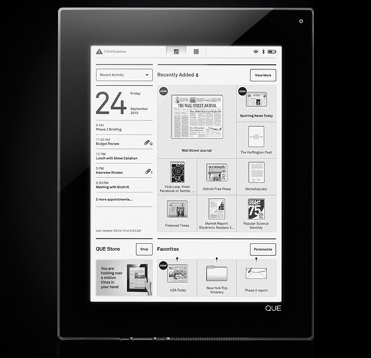 With its sleek 8.5 x 11 inch form factor, crisp large touchscreen display, intuitive user interface and powerful tools, QUE stands out in the crowd. QUE is currently on display at the Consumer Electronics Show in Las Vegas (Central Hall of Las Vegas Convention Center at Booth 11840 anchoring the e-Book Techzone).