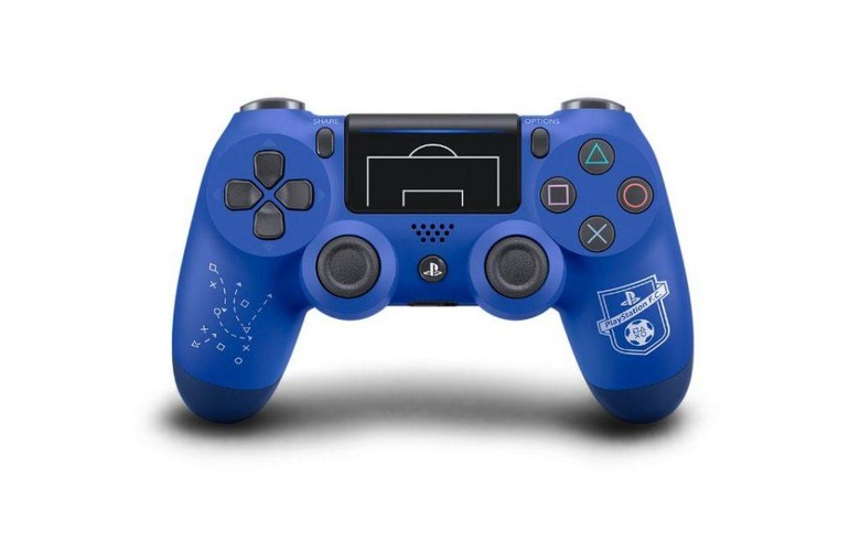 The blue Dualshock 4 controller features embossed penalty lines on the touchpad, along with the PlayStation F.C. logo on the right grip and a football play featuring PlayStation icons on the left grip. That appears to be all the customization this controller has, so if you were hoping for a design that's a little more intricate, we're afraid you're going to be disappointed.