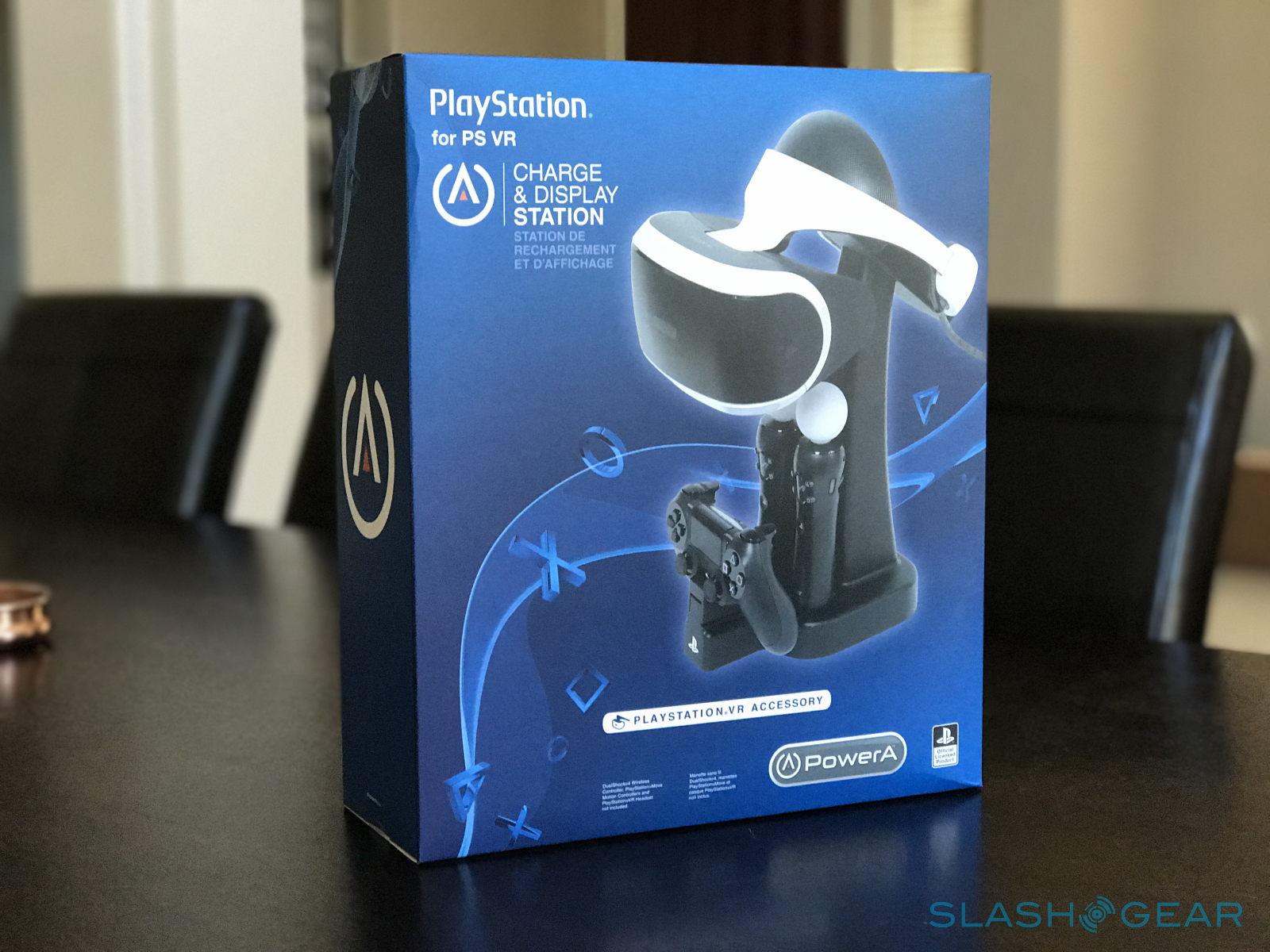 And when you're done playing for the day, you will inevitably need a way to keep those pieces from getting lost. You also need a way to charge the components, like the headset itself and the controllers. Fortunately, there are a few officially licensed accessories for that, like PowerA's Charge & Display Station, which not only charges the VR headset, PS Move controllers, and DUALSHOCK 4, it also holds places them on a pedestal for showing off.