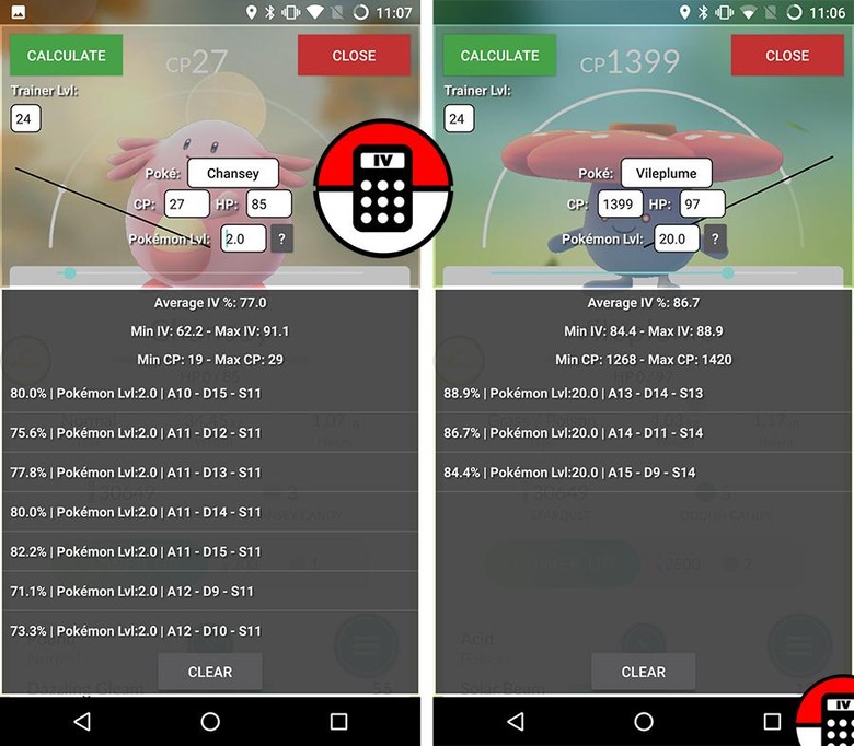 The user enters the name of the Pokemon, CP, HP, and level (as accessed with a protractor system overlay), and calculate values. This system, too, will give the end user a set of possible values – or just one if there's only one possibility.