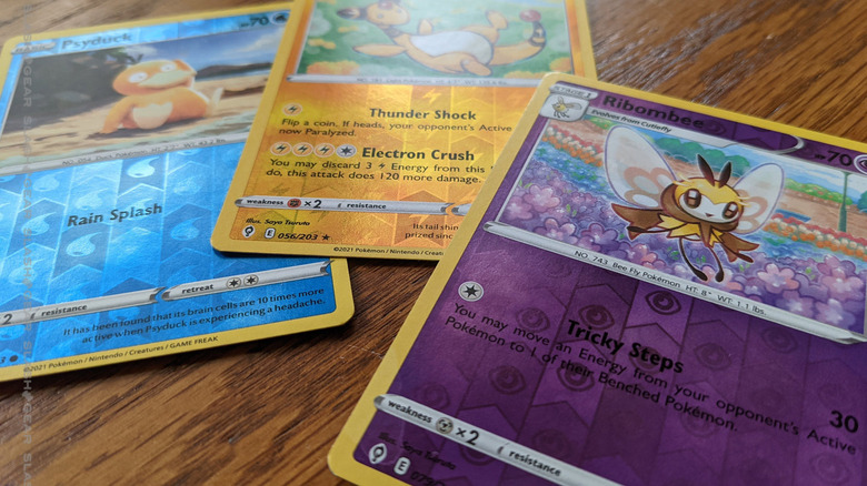 Holo/foil cards in packs continue to use the theme present in the rest of the Sword & Shield sets. We've got a grid of upward arrows (or banners, if you prefer) inside of which the Pokemon type can be found. When the chosen card in a pack is a Trainer card, the symbol is a Pokeball.