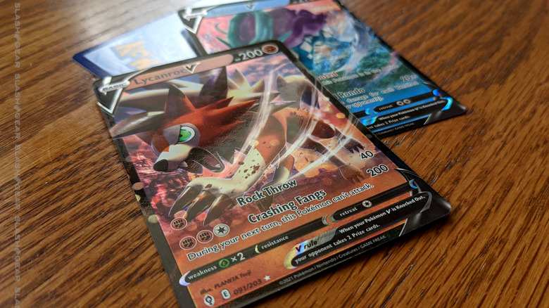 Below you'll see a couple of basic V cards from the set. With cards like Lycanroc V and Suicine V, we get a top-notch skilled application of not only multicolor reflective foil, but of selective gloss. Some parts are flat, some parts are shiny, some parts are shiny or flat with a gloss layer. The works of art on these cards are already great on their own – the prepress skills emphasizing that artwork in each card make it clear why these cards have value in physical form.