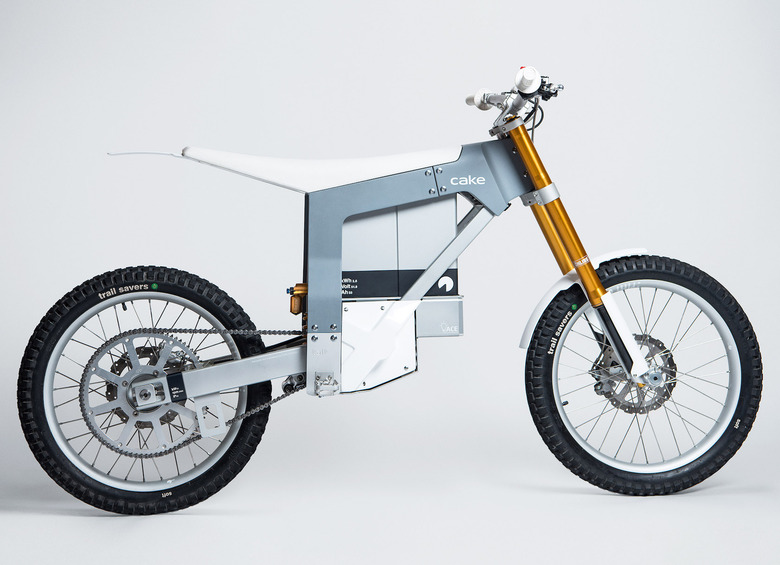 The electric bikes shown being towed by the Polestar 2, incidentally, are the handiwork of fellow Swedish transportation firm CAKE. Its Kalk OR model, shown here, is designed as an electric trial bike, priced at $13,000, with a 2.6 kWh battery rated for up to three hours of trail riding. Like the Polestar 2, it features suspension from another Swedish firm, Öhlins, finished in the company's distinctive gold.