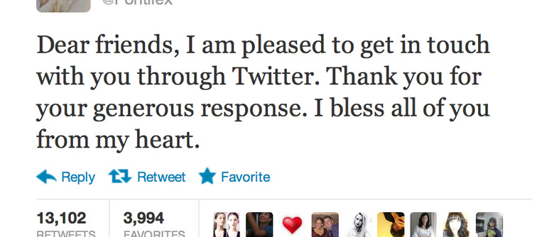 "Dear friends, I am pleased to get in touch with you through Twitter. Thank you for your generous response. I bless all of you from my heart" Pope Benedict XVI