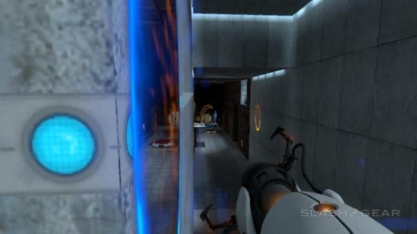 Fire a (blue, for example) portal at the ceiling and another portal (orange) directly below, and whatever you toss in said portal will fall forever, accelerating as it goes. You can use this to your advantage by firing another blue portal at the wall once you've fallen from the ceiling – you'll have the same momentum as you enter the orange portal, then directed horizontally, launching you across the training room.