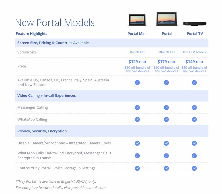 In any case, the new Portal runs $179, while Portal Mini comes in at $129 and Portal TV costs $149. Facebook says that customers can bundle any two Portal devices to save $50 off the total cost, so for instance bundling a Portal Mini and Portal TV will cost $228. Portal and Portal Mini will begin shipping out on October 15th, while Portal TV will start shipping on November 15th. This time around, the entire lineup is launching in the US, UK, France, Italy, Spain, Australia, and New Zealand.