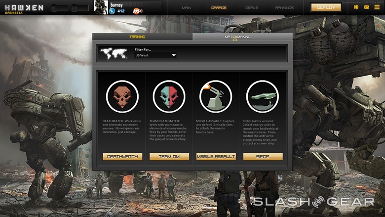The set of multiplayer modes you're working with here in [free beta mode] is currently set at 4 – two basic modes, a Missle Assult mode and a Siege mode. The first two modes are Deathmatch and Team Deathmatch with experience given based on accomplishments through your battle against either your opponent's team or every single other player in the game. Missle Assult mode has you capturing a set of three missle silos and defending them until they destroy the enemy team's base.