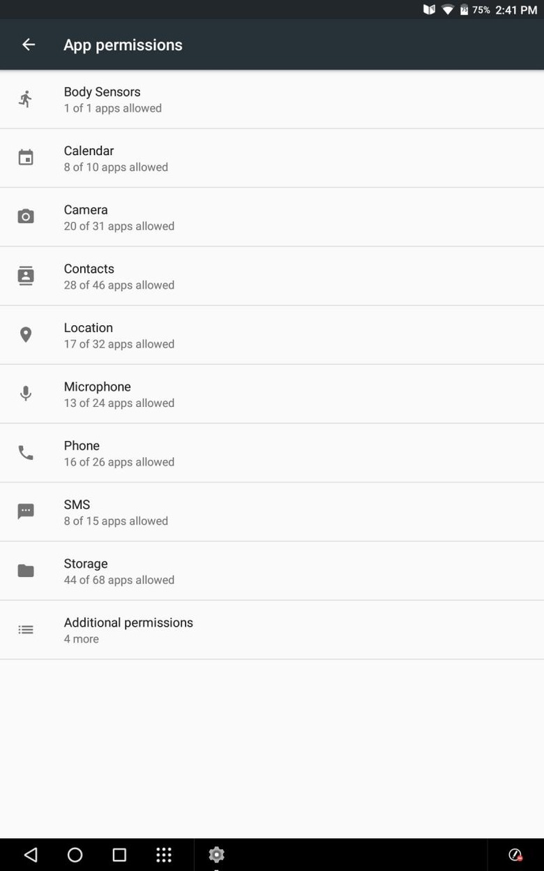 On Android, you can go to the Settings app and select Apps and go through each app to check their permissions. The easier way, however, is to tap on either the menu (three vertical dots) or configure (cog) icon and select App permissions. There you'll be able to see the different kinds of permissions and which apps are using them.