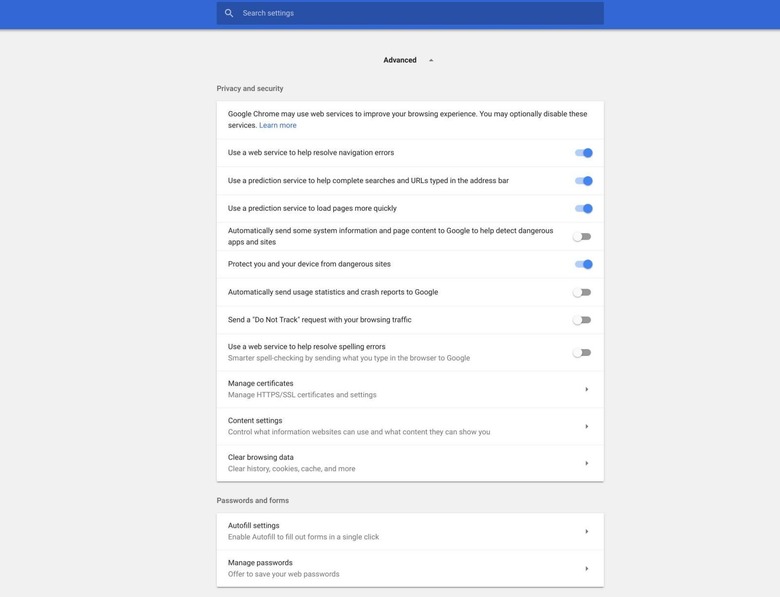 Here you will find settings that will stop websites from tracking you as well as stop Chrome from sending data to HQ. Google has a handy list of what those options mean and what you will be opting out of if you disable them. Be sure to click on Content Settings to see the different hardware permissions available and which websites may have access to them.