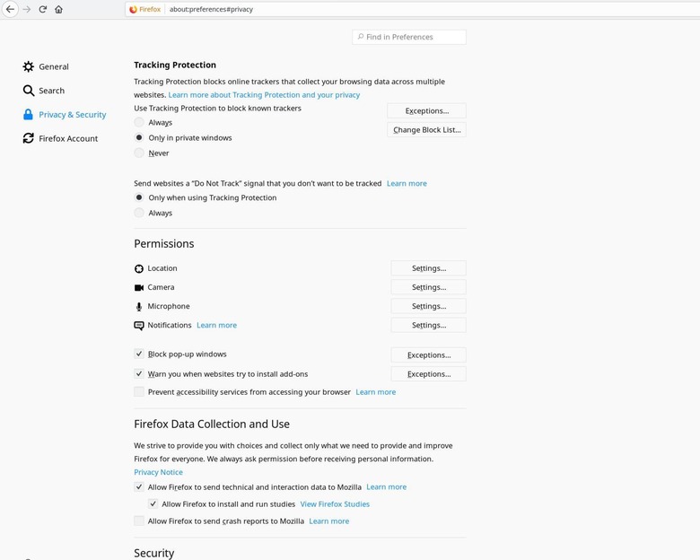 Firefox also has a handy URL shortcut to immediately jump to the Privacy settings. Like in Chrome, you can stop sites from tracking you, give or revoke access to certain hardware, and tell Firefox not to collect your data in the first place.