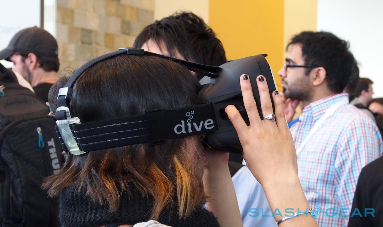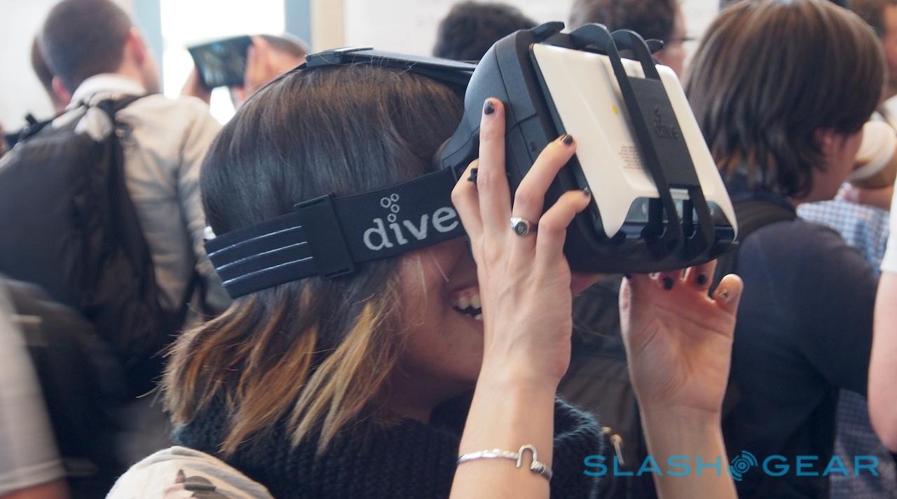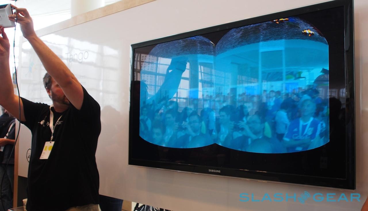 Another demo flooded the Moscone Center with virtual water, complete with fish, turtles, and a shark. Google also had a special headset – like Oculus Rift, but without the integrated electronics – into which the Tango tablet could slide upside down.