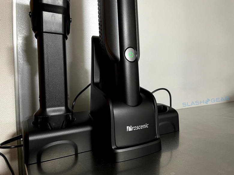 The design of the Proscenic S1 is simple and functional, with the main body taking the form of a large tube with the handle attached at the bottom. The handle is the part that you plug into the charging dock and has the power button that also glows when charging.