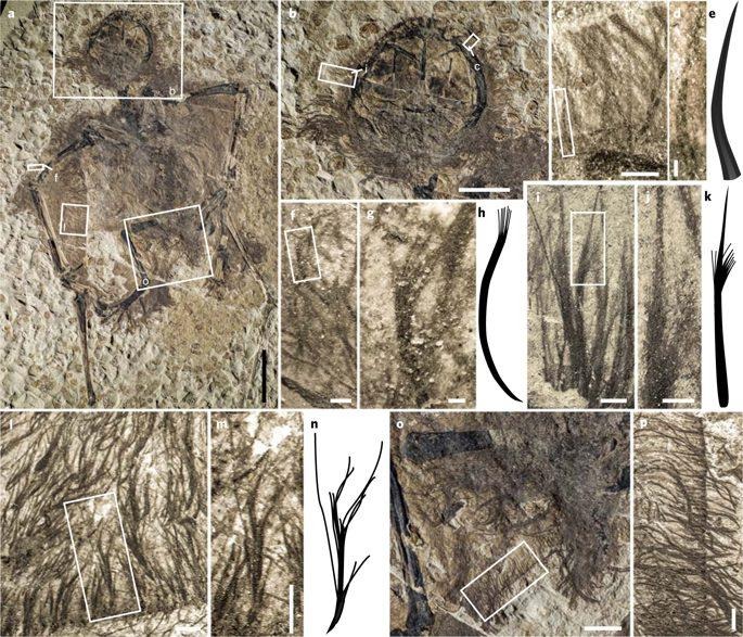 Below you'll see a set of feather illustrations made for the report published this week. Each of these sorts of feather were discovered on the flying dinosaur in the study. This specific illustration was published by Nature with the article cited at the very bottom of this article – also using the same data, from a slightly different perspective.