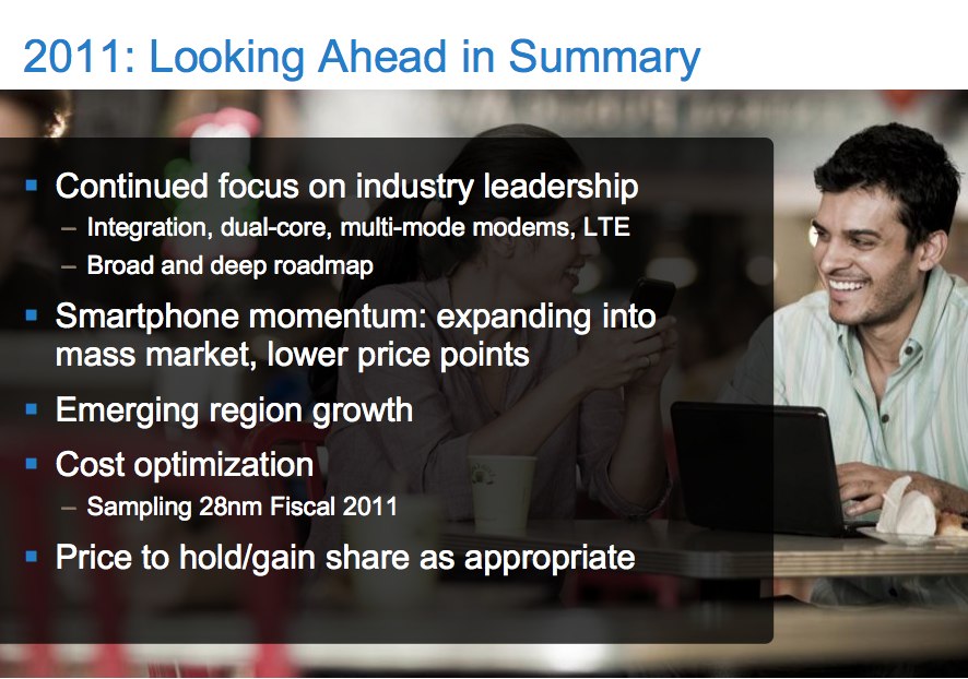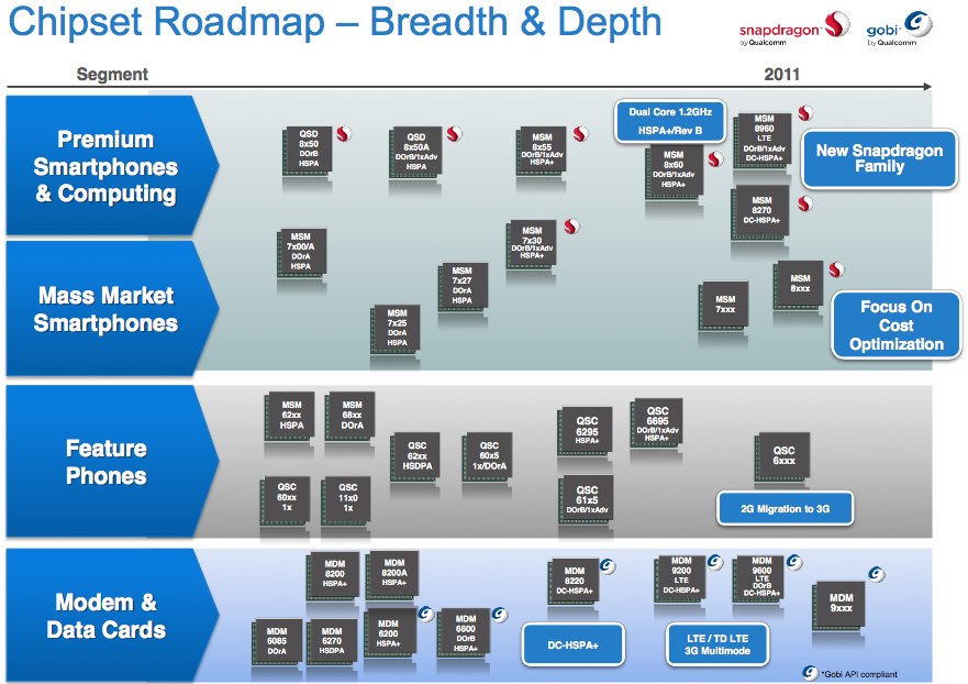 Closer in the pipeline, however, are Qualcomm's dual-core MSM8260 and MSM8660 chipsets, using a pair of current-generation 1.2GHz Scorpion cores along with Adreno 205 GPU, and built using 45nm processes. According to Qualcomm's roadmap, devices using the MSM8260 (which has integrated HSPA+ support) and the MSM8660 (which has HSPA+ along with CDMA and EVDO support) should start appearing on the market in 2011.