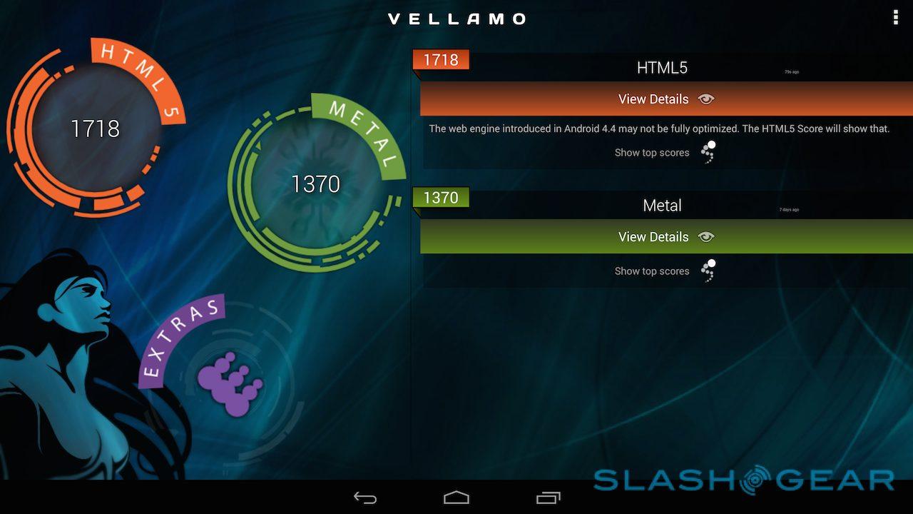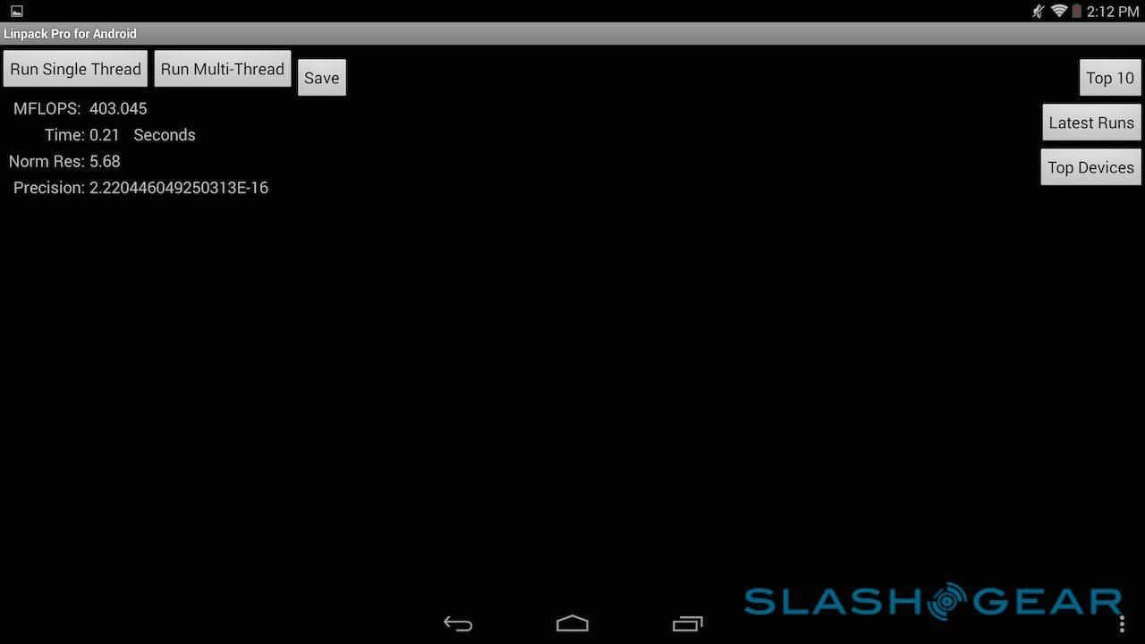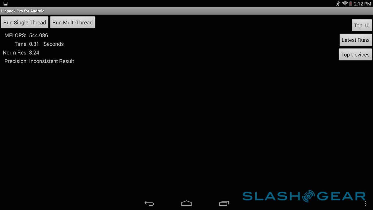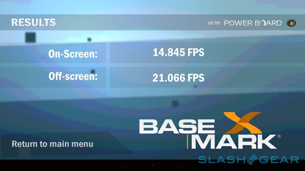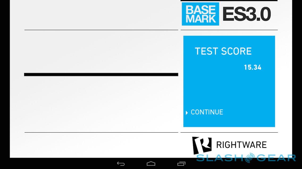 The company's own Vellamo scored 1718 in the HTML5 category and 1370 in the Metal category, while in the 3D Mark Ice Storm Unlimited test it managed 19,744. Basemark X came in at 14.8fps on-screen and 21.0fps off-screen, while the company's ES3.0 test scored 15.34. I also ran CompuBench tests, the full results of which are in the gallery below. SunSpider, the test of browser performance, was completed in 695.6ms (faster is better).