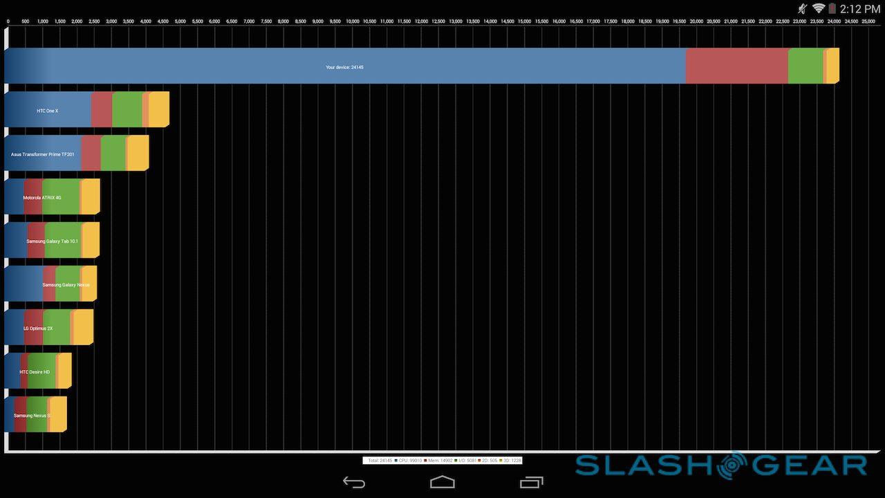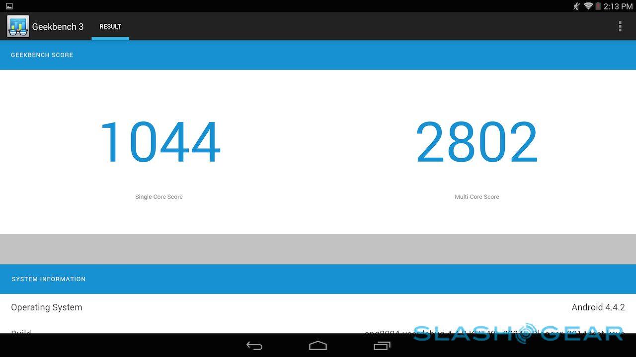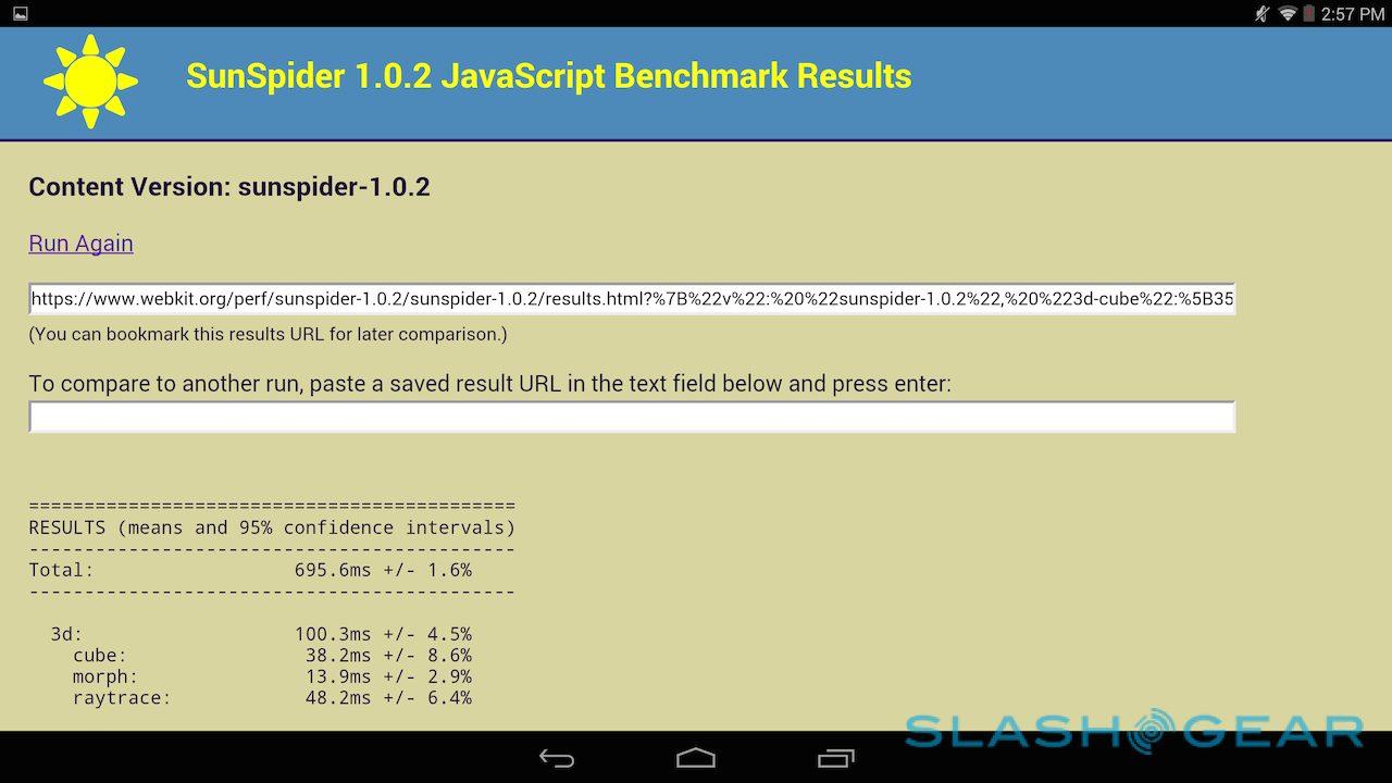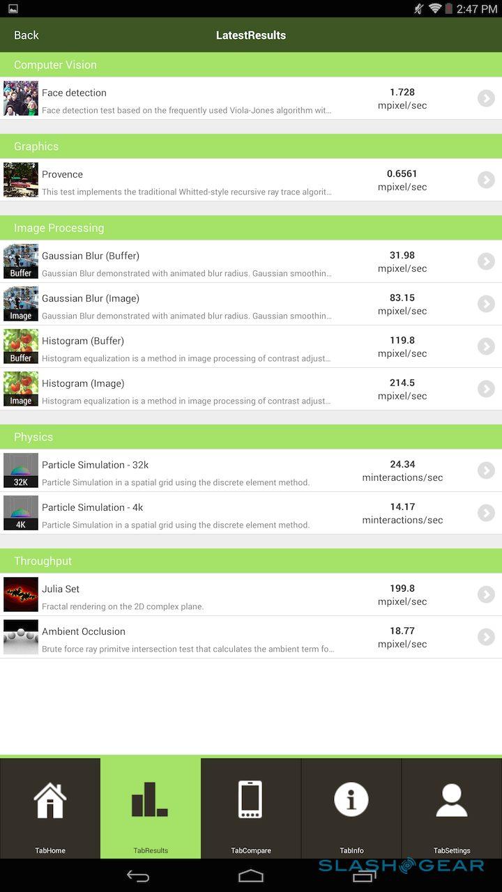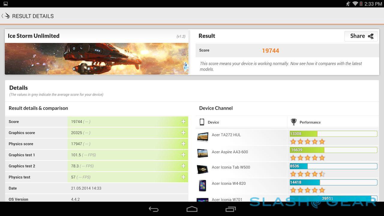 The company's own Vellamo scored 1718 in the HTML5 category and 1370 in the Metal category, while in the 3D Mark Ice Storm Unlimited test it managed 19,744. Basemark X came in at 14.8fps on-screen and 21.0fps off-screen, while the company's ES3.0 test scored 15.34. I also ran CompuBench tests, the full results of which are in the gallery below. SunSpider, the test of browser performance, was completed in 695.6ms (faster is better).