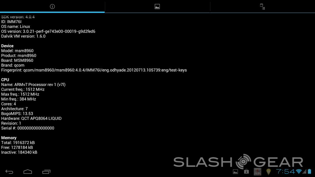 Without getting too technical here the Qualcomm Snapdragon S4 Pro APQ8064 developer tablet kit contains a quad-core processor, 2GB of RAM and is running on Android 4.0.4 Ice Cream Sandwich. This 10.1-inch display running a 1366 x 768 resolution is going to be put through its paces but for now here's a quick glance at a few of the popular Android benchmark apps. Quadrant blew through the roof posting numbers nearing 8000, and AnTuTu clearly was ahead of the other quad-core options available today.