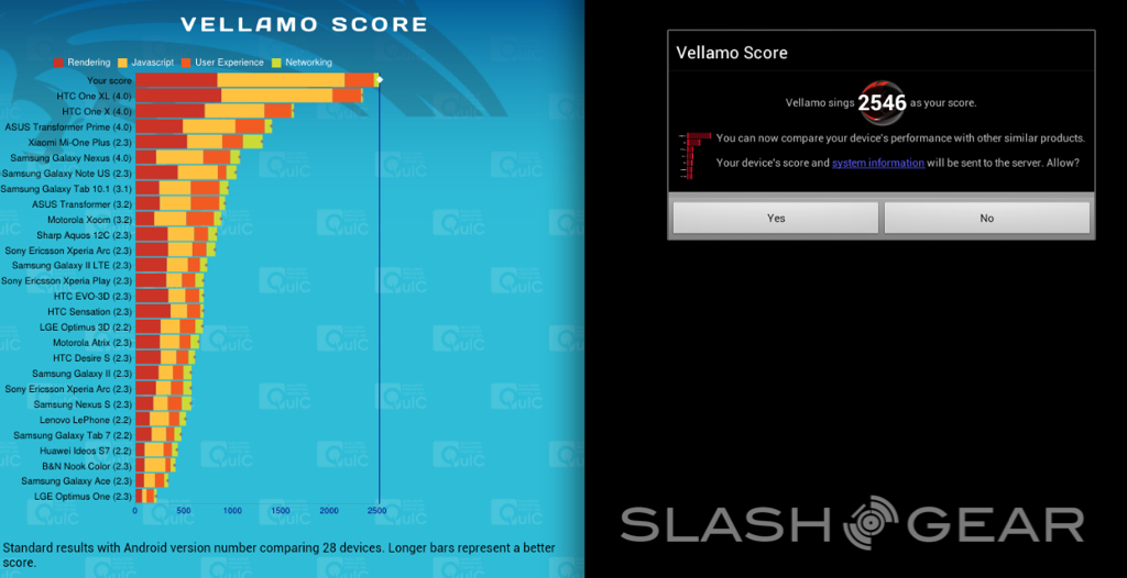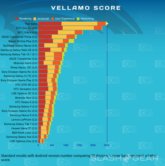 With popular tests such as Quadrant and AnTuTu we clearly see some extremely impressive results. Boasting nearly 8k in Quadrant was plenty exciting, considering most devices are lucky to break 5000 — those of which are all running Qualdcomm's dual-core S4 processor. Anything older isn't quite as lucky, and that includes some other quad-core options on the market. Vellamo, Qualcomm's own in-house benchmark suite that focuses on web browsing also takes charge and scores well with their new quad-core. Results aren't as chart topping as the others, but certainly shows some real progress.