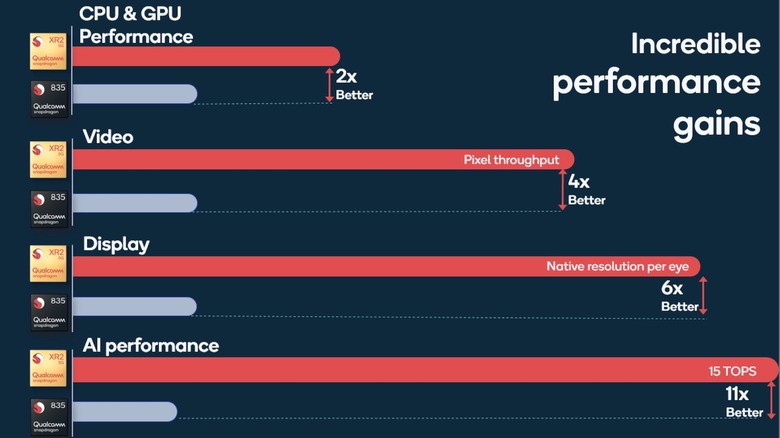 Compared to the Snapdragon 835, there's double the CPU and GPU performance, four times the pixel throughput in video, and 11x the AI performance with a whopping 15 TOPS. Perhaps most important for a mixed reality wearable, there's a sixfold improvement in native resolution per eye, too.