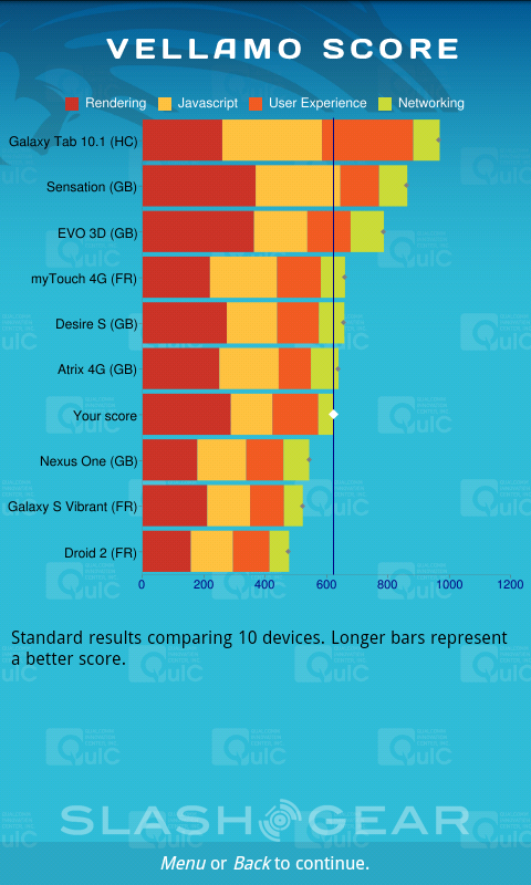 With this test, manufacturers are testing both he performance and the stability of their devices. Our good pal Sy Choudhury, Qualcomm Director of Product Management informs us that while Vellamo was originally developed for internal testing and was indeed used by Qualcomm workers to test as many aspects of web browsing as they could, proving over time to be a fair and non-bias set of tests that'd work to improve not only devices working with Qualcomm chipsets, but any device, as proven by the results of the tests you find after collecting your final score in the test.