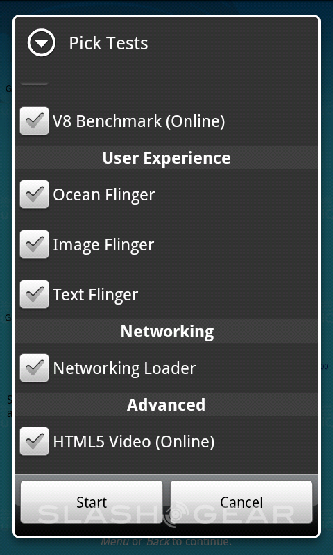 What this system aims to do is test out developers chops, mostly from a manufacturer standpoint, and see that they can perform well in a series of tests that see CPU and memory, Javascript, HTML5, canvas rendering speed, scrolling, network access, and more. When you run this benchmark suite, you'll be able to choose from amongst the handful of test you want to perform, be they in Rendering, Javascript, User Experience, Networking, or "Advanced." Each of these categories can be found in a section of the app called Pick Tests. And pick them you shall, for this test not only has the ability to show you your final cumulative score, it can give you the results of each individual test separately, all in a series of quite simple and well-designed screens. Well played!