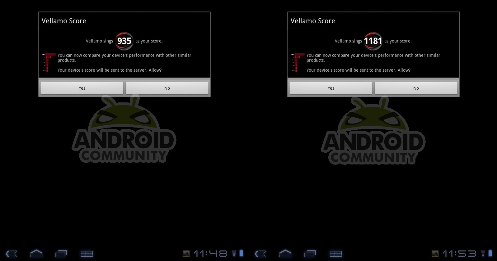 The top score on the chart generally ends up being a Samsung Galaxy Tab 10.1 (with an NVIDIA Tegra 2 processor inside), but my colleague Cory Gunther from Android Community has already made quick work of that with a swift overclocking of his Motorola XOOM tablet, beating the Tab's score of 957 with a cool 1181. Below you'll see the sweet score yours truly got with the new myTouch 4G Slide from T-Mobile. It's a dual-core as well, running a 1.2GHz dual-core Snapdragon processor under the hood, but you'll quickly see it simply doesn't add up when it comes to the slightly bigger guns in this game – ALSO note that it's not overlocked in anyway, so that matters too.