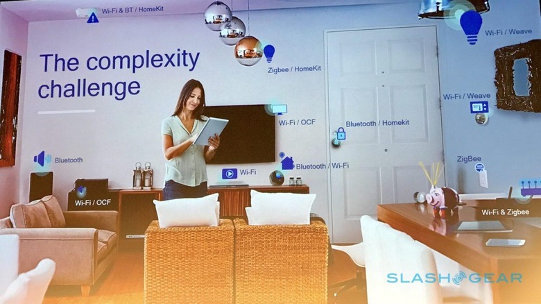 The chips themselves have a dedicated ARM Cortex M4 CPU for running applications, and then a second, low-power ARM Cortex M10 for both the Bluetooth LE and 802.15.4 control. There's an integrated sensor hub for faster reaction to inputs without needing to wake the main processor, and both will support things like Bluetooth mesh networking, where multiple IoT devices join up with each other rather than necessarily linking to a single hub.