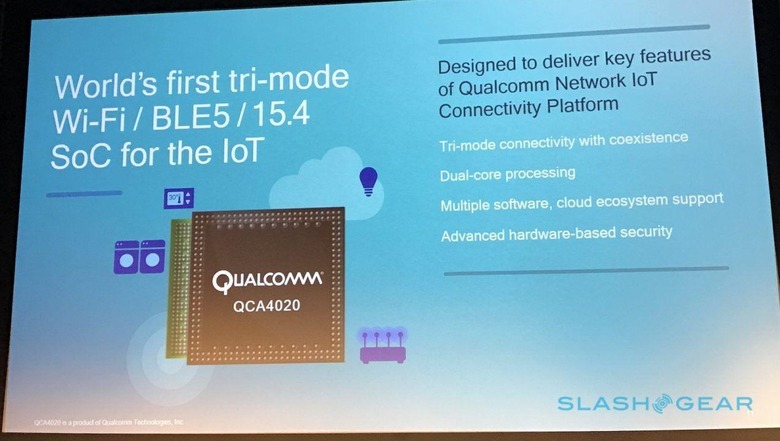 Meanwhile, there are two new Internet of Things chips which Qualcomm is hoping will make a low-power splash in the market. The QCA4020 packs three popular IoT radios into one: Bluetooth Low Energy 5, dual-band WiFi, and 802.15.4-based wireless like ZigBee and Thread. Its sibling, the QCA4024, combines two, leaving out WiFi.