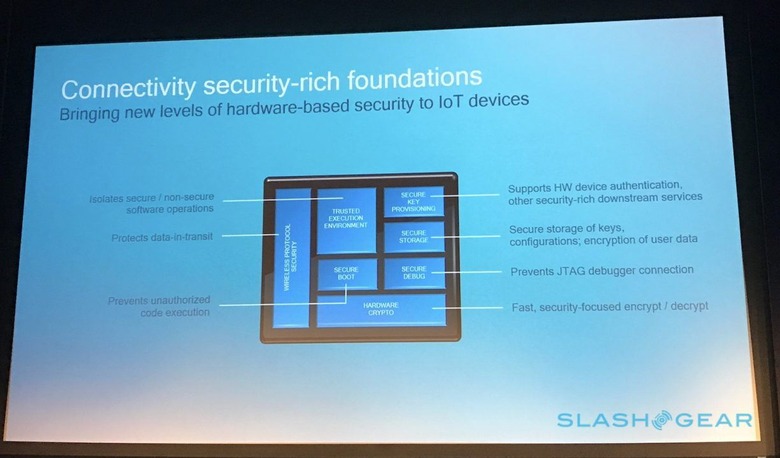 The goal is to not only pack all of the connectivity into a single SoC, but make it compatible with as wide a range of IoT standards as possible. So, it'll be compliant with Apple's HomeKit and the Open Connectivity Foundation specification, in addition to the AWS IoT SDK and Microsoft's Azure IoT Devices SDK. They have hardware-based security, too, including secure boot, trusted execution, key provisioning, and wireless protocol security.