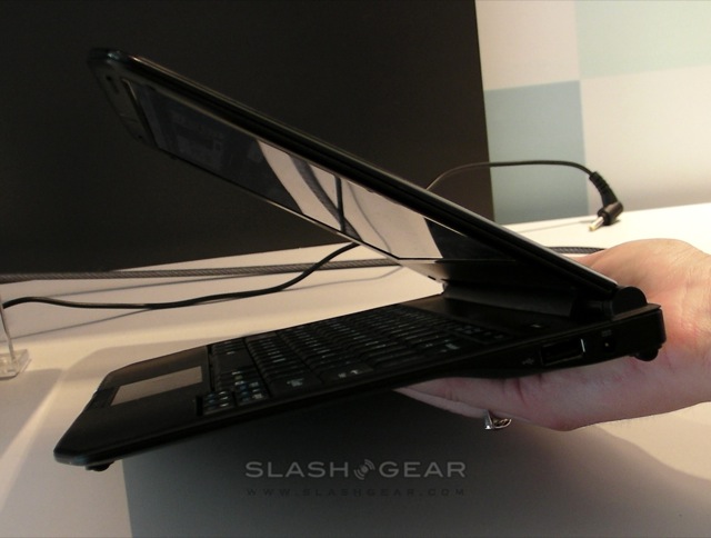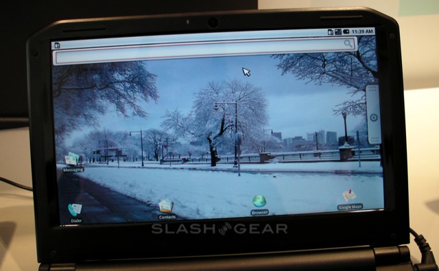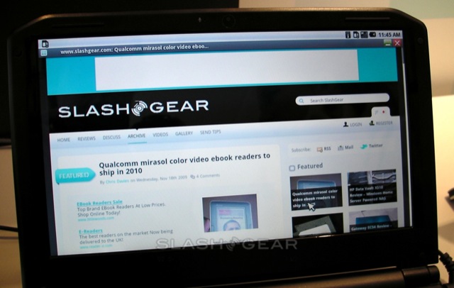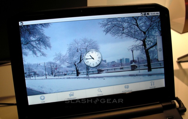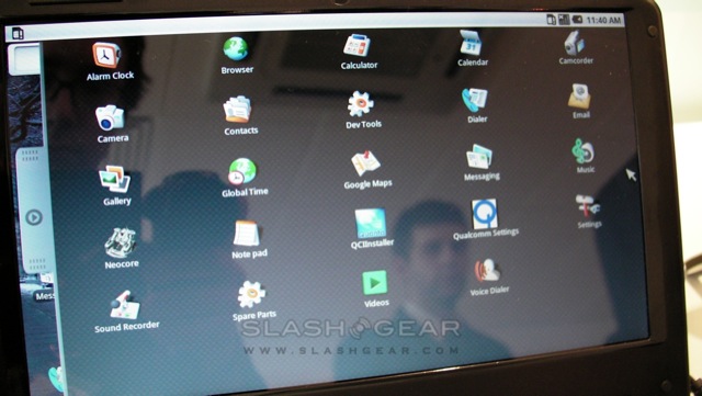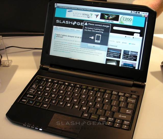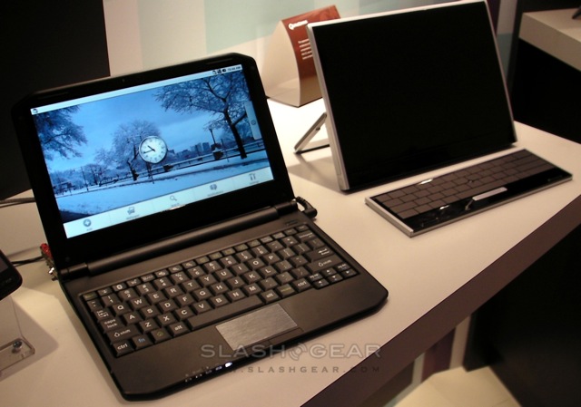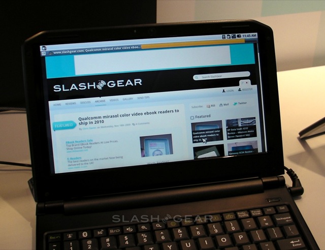 The Quanta machine looks ostensibly like a regular netbook, but it's considerably thinner – helped by the fact that it's based on Qualcomm's Snapdragon chipset and thus requires no active cooling fan. Its display isn't a touchscreen – we left fingerprints all over it trying to find out – but Quanta have reworked the keyboard to offer one-touch access to not only the homescreen (which still offers three customisable panes) but the slide-out programs menu, key apps like the browser, and individual control over WiFi, 3G and Bluetooth.