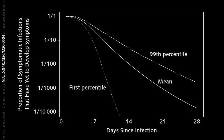 For more information, see DOI:10.7326/M20-0504 for The Incubation Period of Coronavirus Disease 2019 (COVID-19) From Publicly Reported Confirmed Cases: Estimation and Application. This paper was published in the Annals of Internal Medicine, authored by Stephen A. Lauer, MS, PhD, and Kyra H. Grantz, BA, (shared lead authorship), et. al. on March 10, 2020.