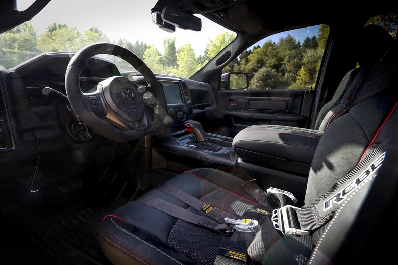 Extra vents, composite wheel arch extensions, and forged steel brush guards made sure the Ram Rebel TRX looked the part as much as it drove that way. You could say Ram was over-compensating with the truckls five-inch, side-exit exhaust ports, but the automaker probably wouldn't hear you over the HEMI's rumble. Inside, suede and fabric bucket seats and a rear bench were paired with six-point harnesses, along with a custom camera mount for your GoPro, and tough-wearing rubber treatments.