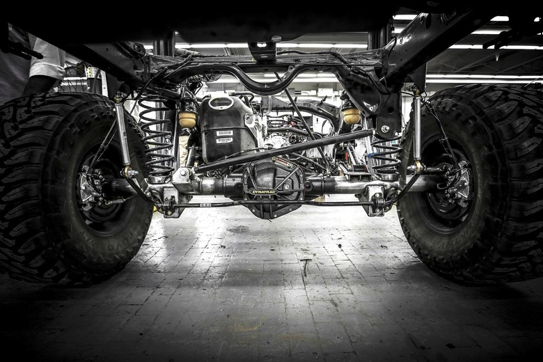 Unsurprisingly with all that power, Ram had to mix up production Ram 1500 parts with some new components. The standard Ram 1500 front axle was paired with an open differential and custom CV half-shafts, with the spindles pushed forward so that there'd be space for the huge 37-inch tires. At the back, meanwhile, a Dynatrac Pro 60 axle is hooked up to an electric, selectable locker to 35-spline, 1.5-inch axle shafts.
