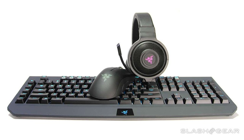 Razer has cemented itself as an industry leader in the gaming peripherals business, and here with their "Chroma" line, these accessories get colorful. To be clear – these are the same devices that've been on the market for some time – they're just being released in the Chroma line with light-up bits. We've got the Razer BlackWidow mechanical keyboard, DeathAdder mouse, and Kraken 7.1 USB headset. The review you're seeing here is for the headset specifically – you can also catch our DeathAdder and BlackWidow reviews lighting up immediately if not soon.