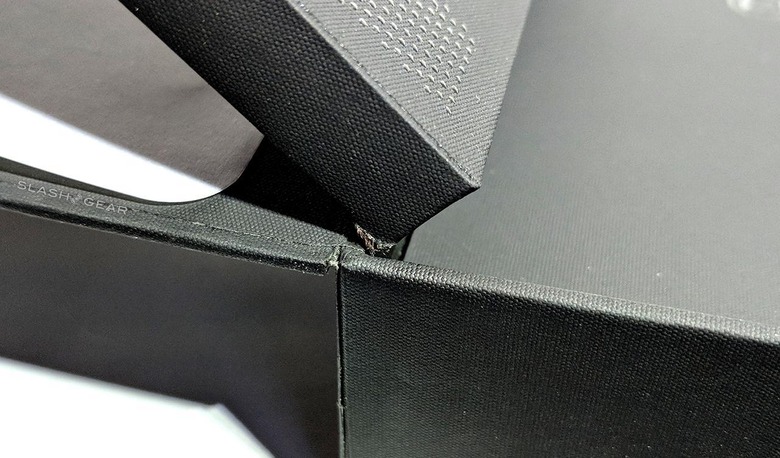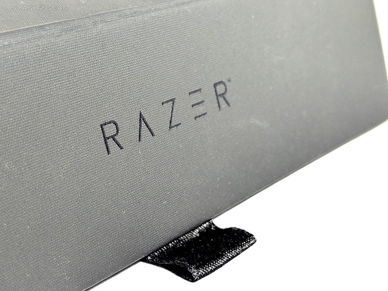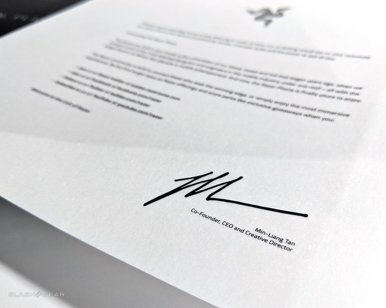 The top of the box is held in place with magnets that hide under the paper, loosened with a ribbon over the edge. A semitransparent piece of paper with the co-founder and CEO Min-Liang Tan's endorsement sit first in this stack of items. A similar paper rests in the boxes of some of Razer's other most elite products as well.