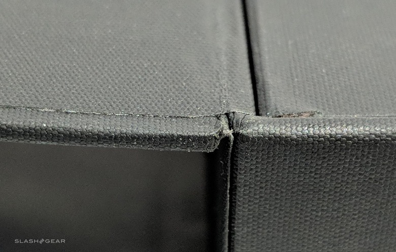This device comes in a box made with bookboard sides, covered with black, textured paper finely wrapped around each edge. This box is a perfect example of what quality craftsmanship looks like. This box could act as an ideal example of what a finely crafted artists book cover looks like. I really, truly only found the most tiny of flaws – basically invisible to the average onlooker.