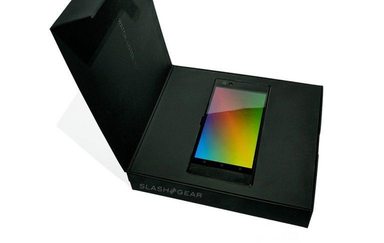 The phone itself is next, resting in the center of the box in a concave plastic dish. This layer of box is also wrapped in the same high quality textured black paper as the rest of the box. This layer moves on a hinge held by the same high-quality textured paper as the rest of the box.