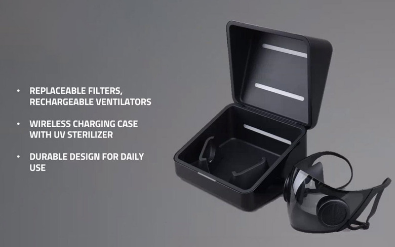 Plastic shielding allows the user's face and mouth to be seen – further aided by the LED lighting within. This device's battery is charged with a wireless charging case that also provides UV light disinfection.