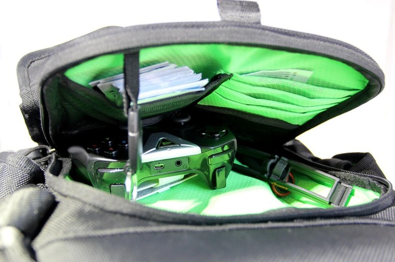 The front flap is excellent for carrying slightly larger devices like an NVIDIA SHIELD Tablet, keys, and my laptop power cord.