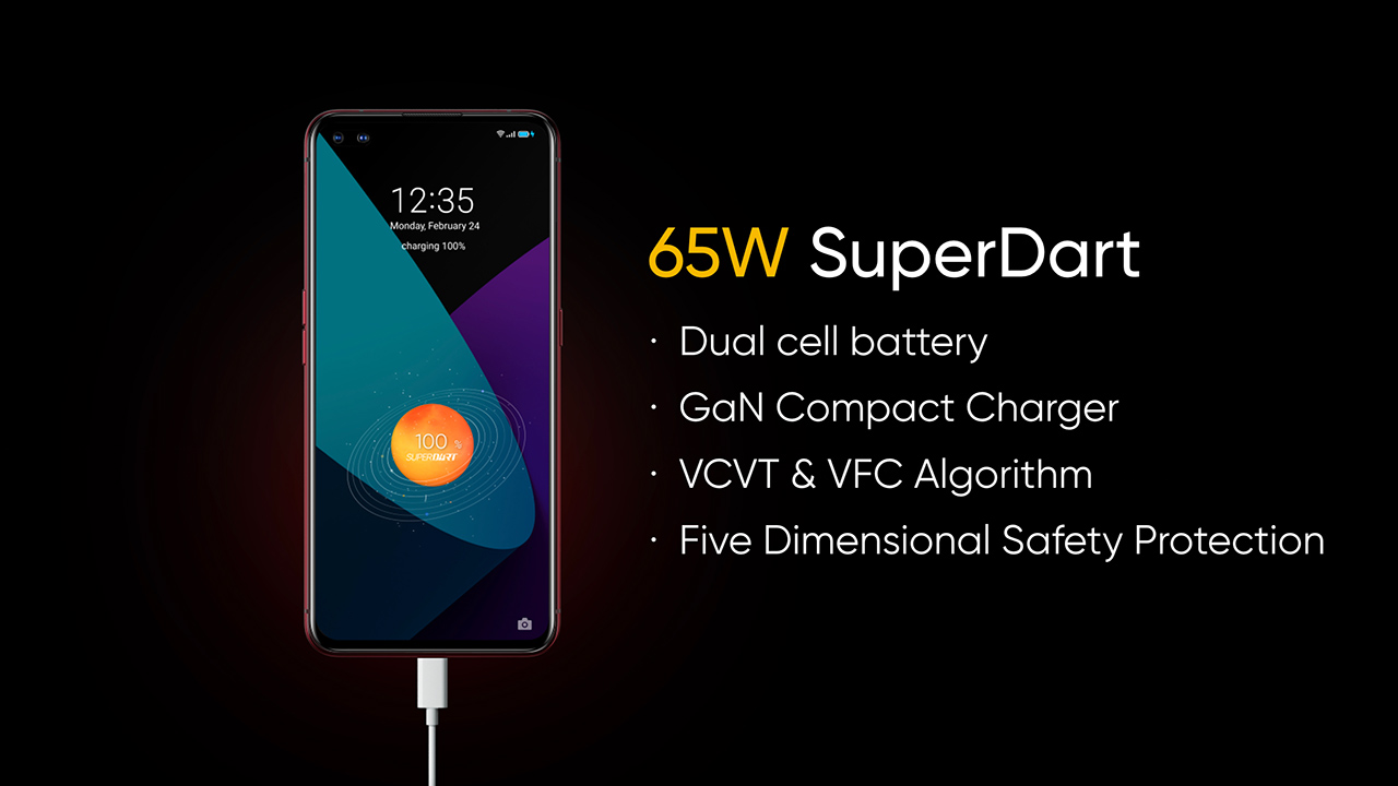 This phone has 65W "SuperDart" fast charging, which realme suggests will allow the device to be "fully charged in 35 minutes." That's 35 minutes for a whopping 4200mAh of battery – that's no small feat! There's an in-display fingerprint reader for quick unlock of the device, as well as a pill-shaped cut-out for the phone's front-facing cameras.
