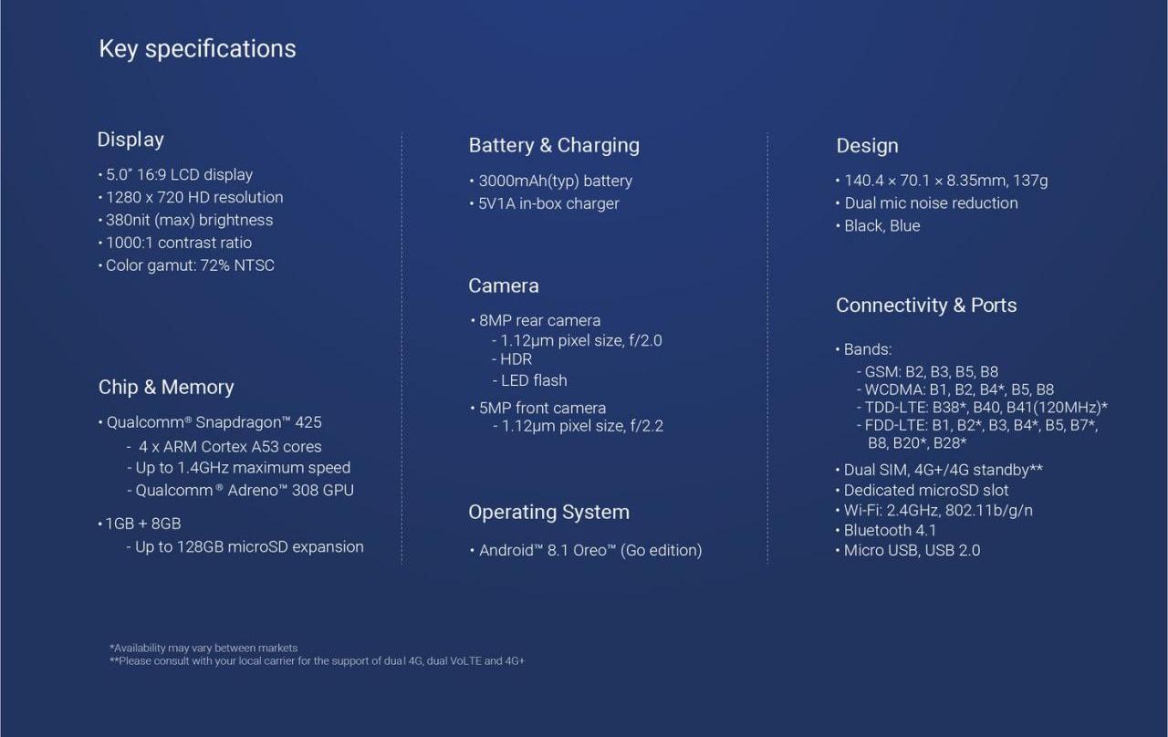 In this case, the Redmi Go will be running on a Snapdragon 425 with 1 GB of RAM and up to 8 GB of thankfully expandable memory. The 5.0-inch LCD screen has a traditional 16:9 1280x720 HD resolution, which also means thick bezels all around. There's an 8 megapixel main camera and a 5 megapixel selfie shooter which may be barely serviceable. Given those specs, the 3,000 mAh battery could last more than just a day.