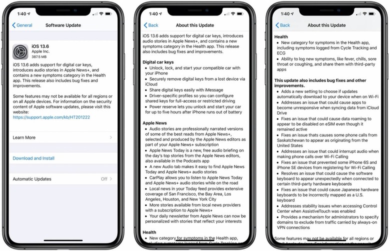 Apple has released iOS 13.6, bringing support for its new digital car key tech, as well as boosting new symptom categories in the Health app. Intended for those iPhone owners who aren't already experimenting with the iOS 14 public beta, iOS 13.6 also adds support for the new features of Apple News, such as professionally narrated stories from Apple News+.